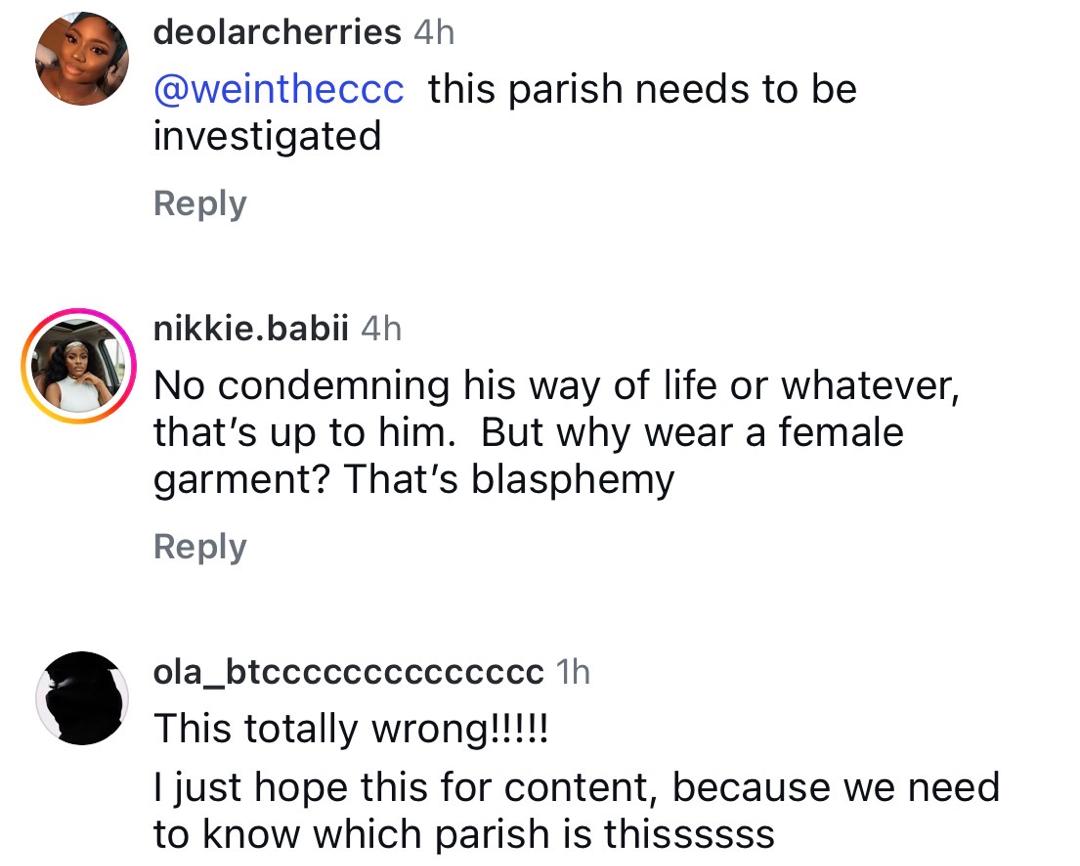 The aggrieved church members argued that when a man dresses like a woman and is welcomed into a parish, it dents the image of the entire church and should not be accepted. One of them even tagged his act a Blasphemy.